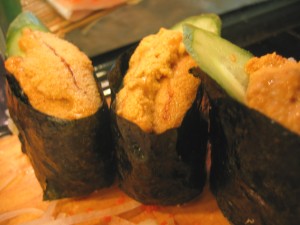 我們三個人是坐在料理台前面的,所以所有東西都是直接跟大廚點,大廚當場做給我們吃。那當然海膽這種超級美食,是對不能放過的啦∼∼(這海膽做得比一般的壽司還大,要吃兩口才能吃完,真是爽翻天)