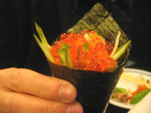 這是我特別加點的鮭魚卵手卷,超好吃,只可惜它的卵是用不知道什麼酒去泡的,所以我吃的時候有一點給它怪怪。