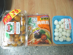 這是等一下我要煮的晚餐,其實也沒什麼,就是鍋燒麵和加些鳥蛋。還有一大包的茼蒿拿去泡水了,所以沒拍到。我還買了什麼黃金蕃茄的,聽說不錯吃。啊,還有一個爆米花沒拍到…